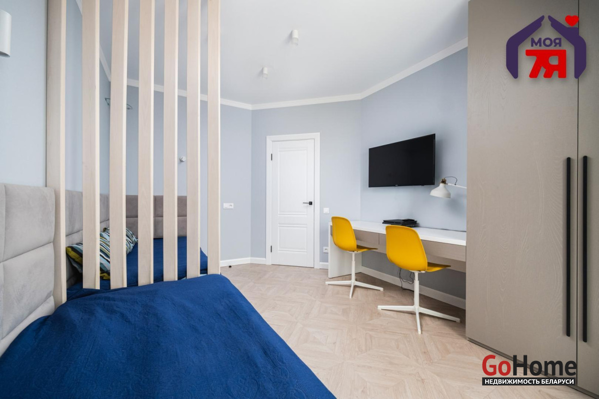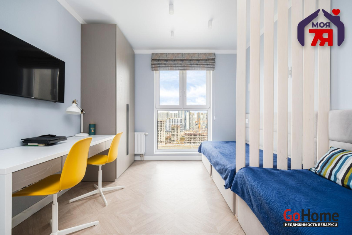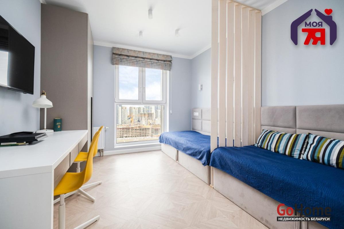 - Детская спальня оформлена в спокойных тонах: на полу паркетная доска, стены - норвежские обои. Встроенная система хранения, перегородка из массива дерева, кровати-диваны выполнены под заказ. Светильники "Novodvorski" создают мягкое, уютное освещение. Вся мебель остается.