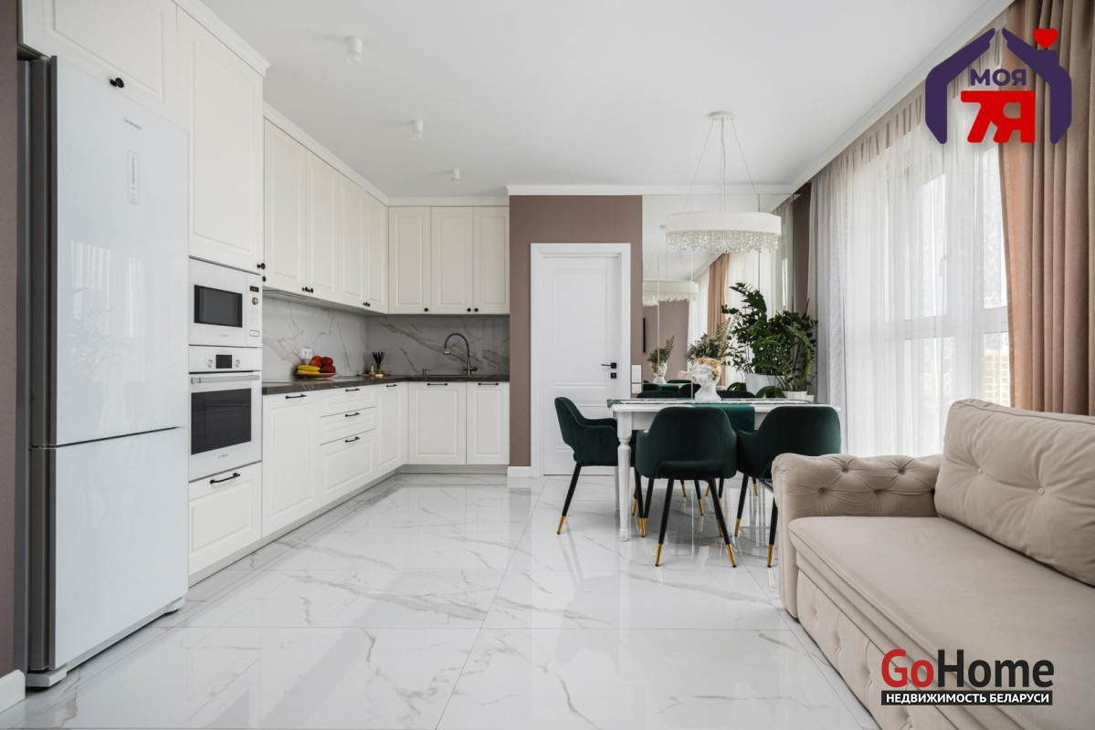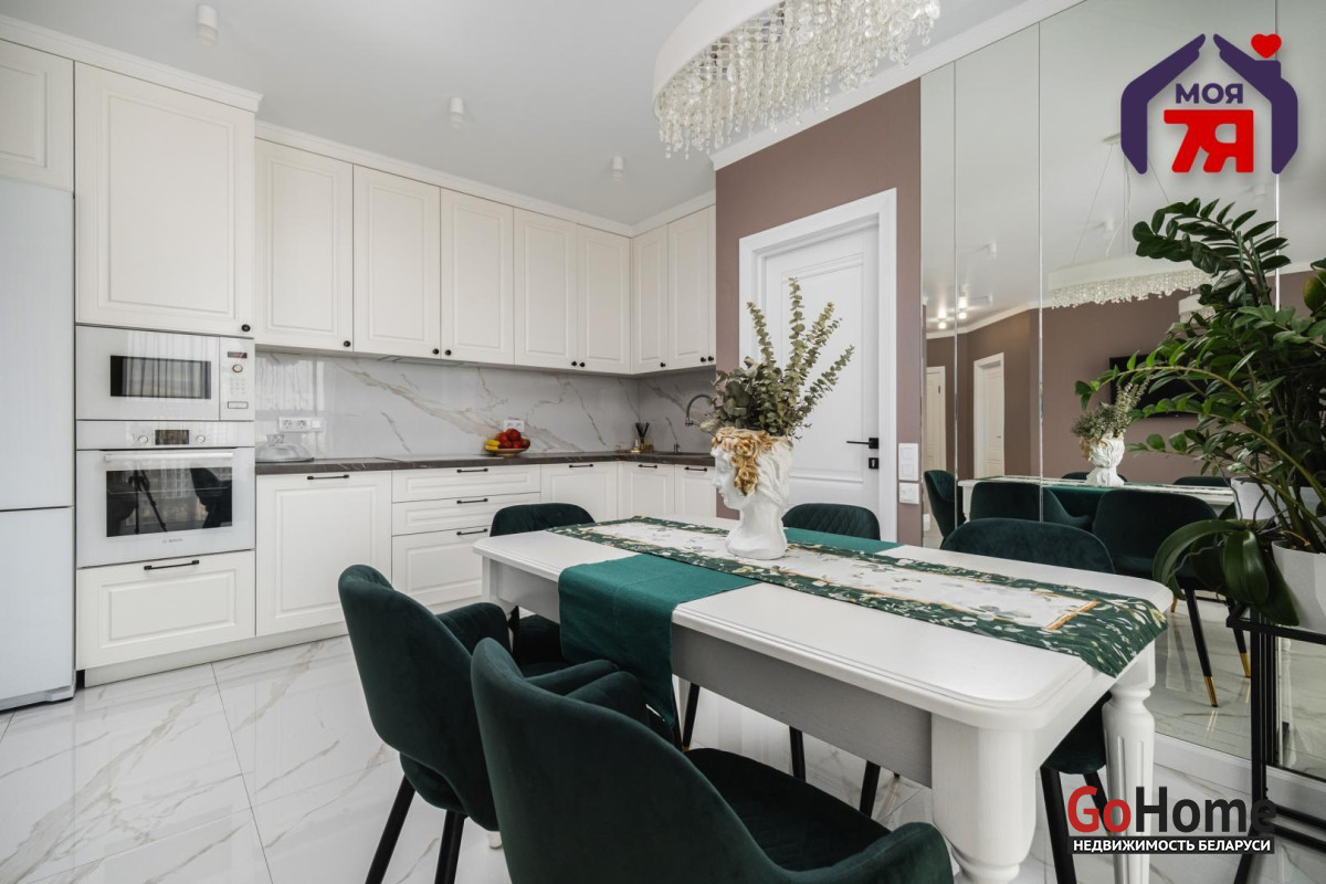 - Встроенная кухня выполнена с крашеными фасадами, установлены посудомоечная машина, измельчитель для мусора в раковине, фильтр для воды и бойлер. Вся мебель и техника остаются покупателю.