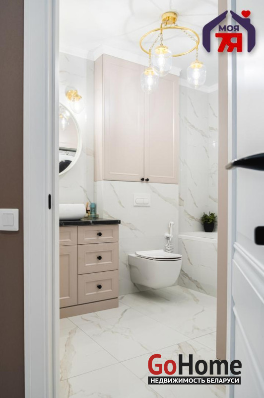 - Ванная комната оформлена в светлых тонах: на стенах и полу - крупноформатный итальянский керамогранит 120×60. Установлена акриловая ванна, смесители Roca, душевая система, биде, стиральная и сушильная машины, бойлер, электрический полотенцесушитель и тёплые полы. Мебель с крашеными фасадами, фурнитура премиум-класса.
