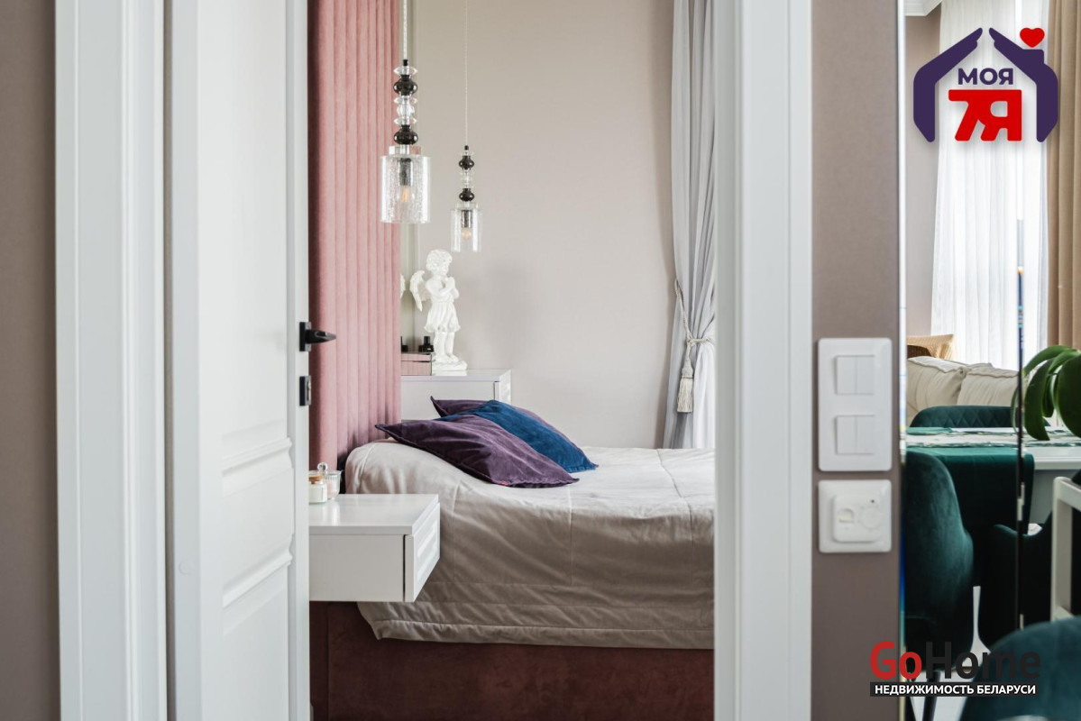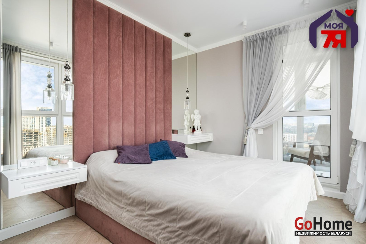 - Основная спальня также продумана до мелочей: паркетная доска на полу, норвежские обои и зеркала на стенах, натяжной потолок. Вся мебель, включая кровать и шкаф-купе с крашеными фасадами, изготовлена на заказ и остаётся новому владельцу.