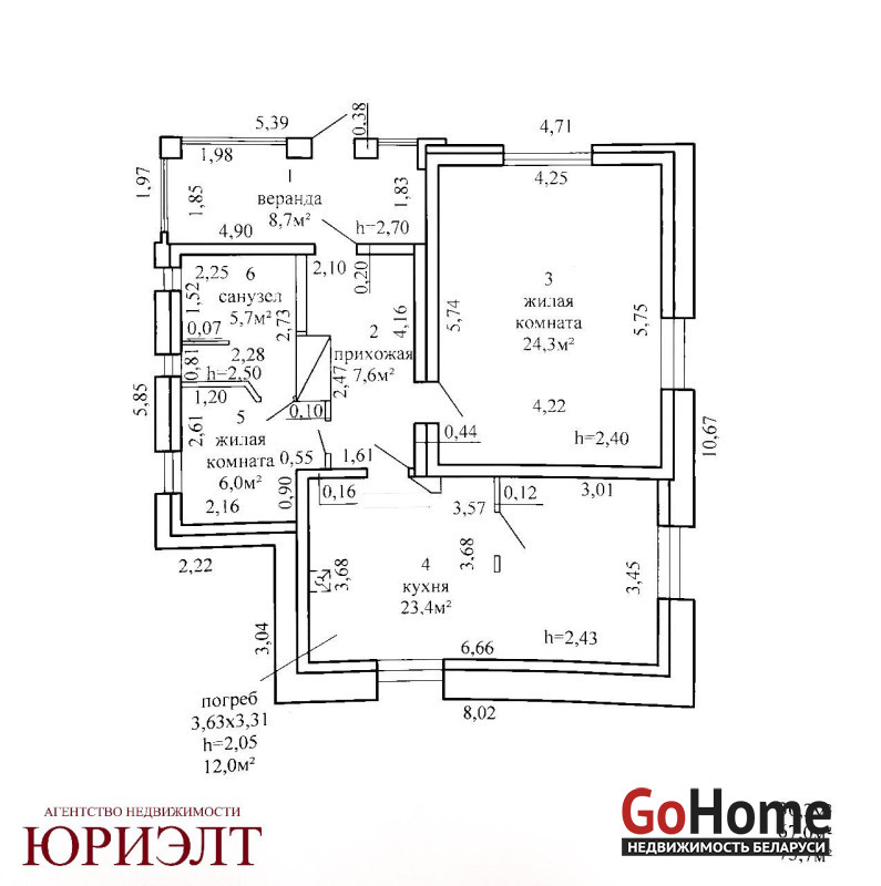 Общая площадь дома 75.7 м2 (по СНБ), общая площадь жилых помещений 67.0 м2, жилая площадь 30.3 м2, кухня-гостиная 23.4 м2.