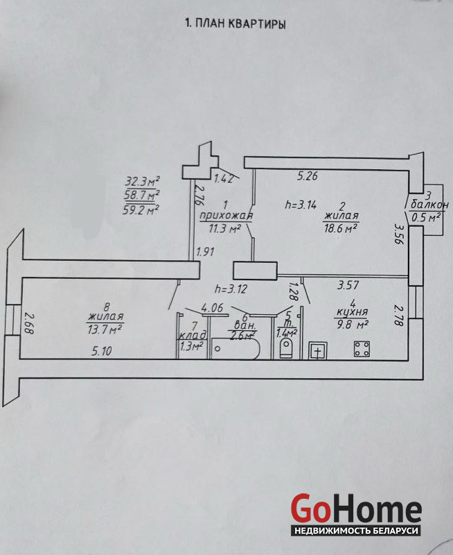 - Идеальная планировка: изолированные комнаты, раздельный санузел, просторная кухня 9,8 м² и высокие потолки 3,14 м.