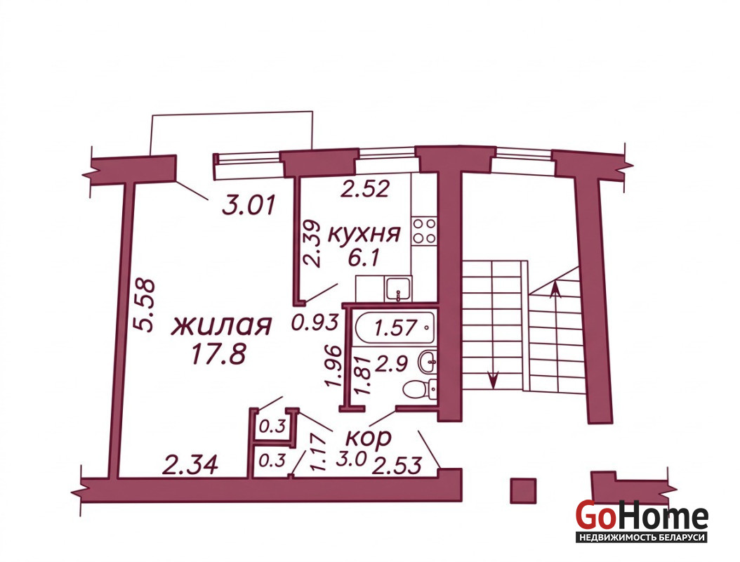 Квартира находится на 2 этаже 4-этажного кирпичного дома. Год постройки дома - 1963. Общая площадь - 30.5м2, жилая - 17.8м2. Санузел - совмещенный.