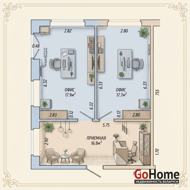 Помещение 52.4 м2, разделено на 2 комнаты. Выполнен новый современный евроремонт, высота потолков 2.97м. Есть мебель. На окнах установлены роллеты. Интернет – оптоволокно, телефонные линии.