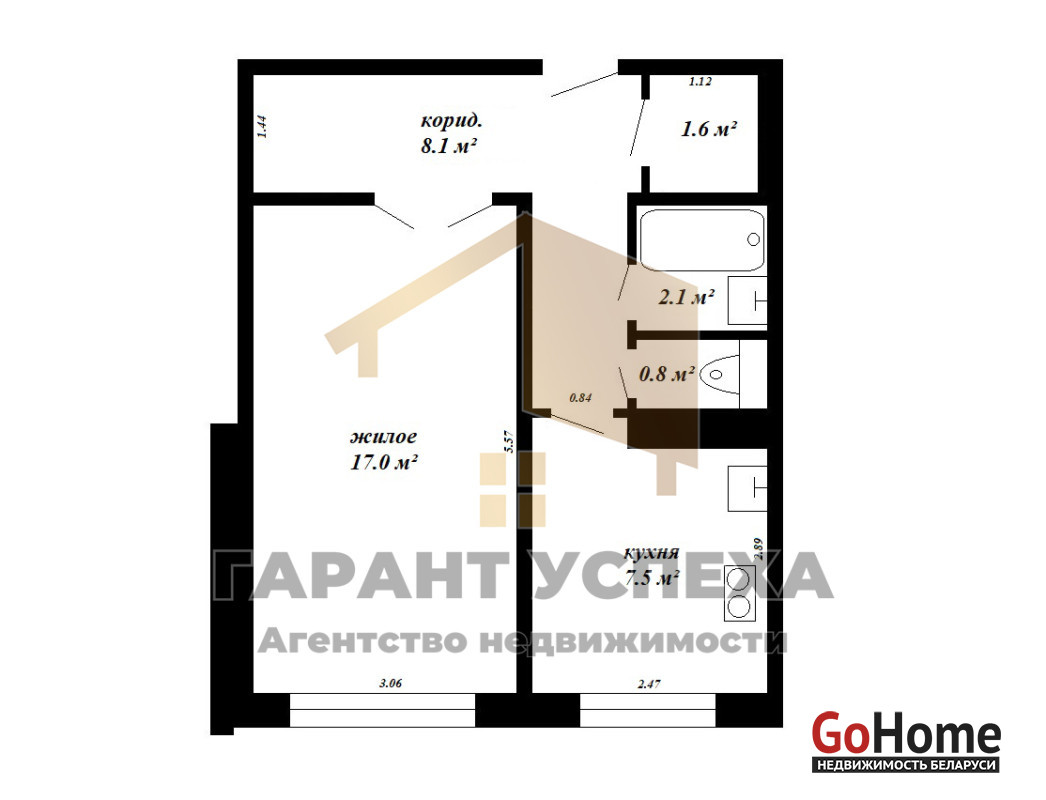Общая площадь квартиры - 37,1 кв.м, жилая площадь — 17,1 кв.м, площадь кухни — 7,5 кв.м.