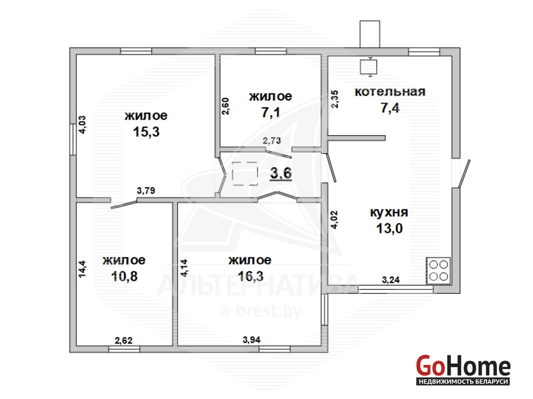 Жилой дом в Каменецком р-не. 1958 г.п. 1 этаж. Общ.СНБ - 73,5 кв.м, общ.- 73,5 кв.м, жил.- 49,5 кв.м, кух.- 13,0 кв.м. 4 комнаты, высота потолка - 2,50 м.
