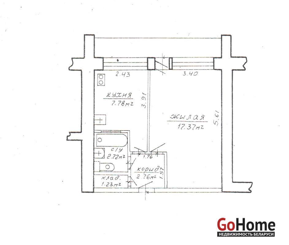 Общая площадь квартиры по СНБ – 35,8 кв. метров, общая- 31,9 кв. метров, жилая- 17,4 кв. метров , кухня-7,8 кв. метров.