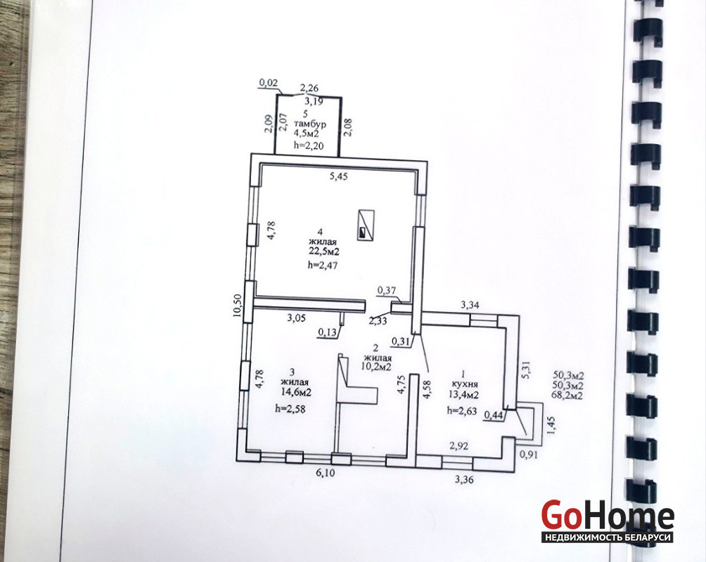 Площадь: общая — 68,2 м2, жилая — 50,3 м2, кухня — 13,4 м2.