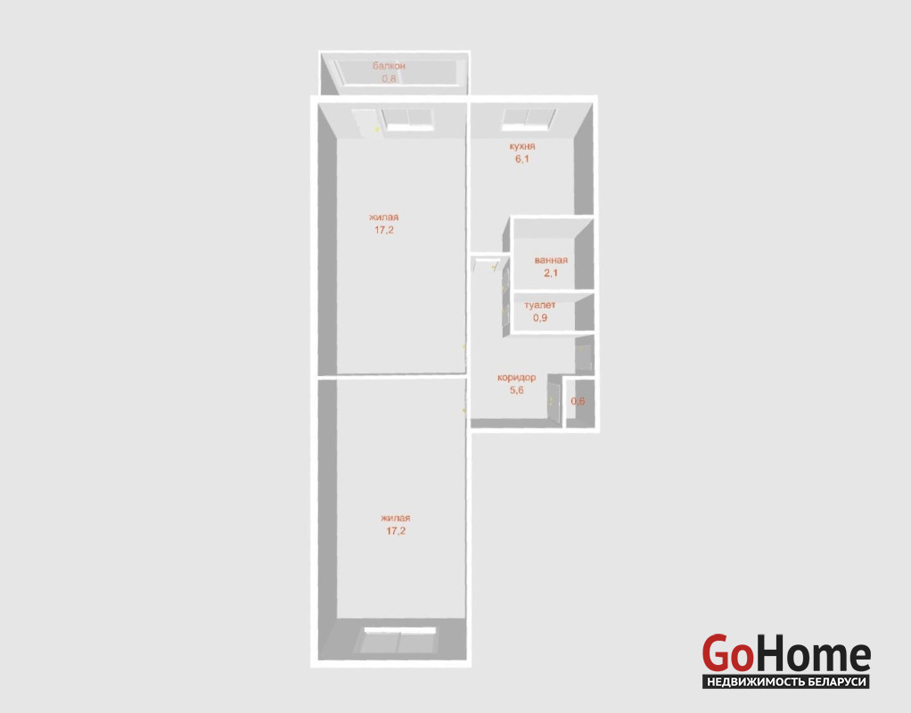 Площадь по СНБ – 50,5 м2, общая – 49,7 м2, жилая – 34,4 м2, кухня – 6,1 м2, 2 большие комнаты по 17,2 м2, раздельный санузел. Имеется подвальное помещение 4 м2.