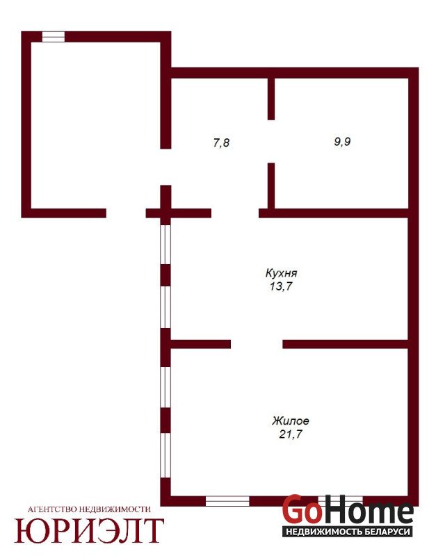 Одноэтажный дом общей площадью 53,1 кв.м. состоит из: санузла, бани, кухни, и 2 жилых комнат.