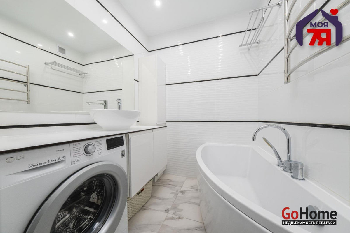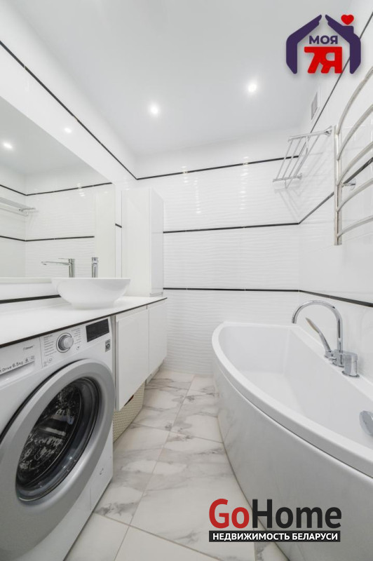 -Санузел раздельный, что очень удобно и функционально. В ванной комнате установлена качественная ванна, есть стиральная машина, большое зеркало. В туалете установлен подвесной унитаз.