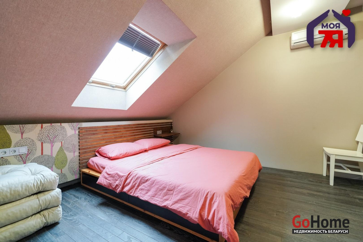 - Спальня оформлена лаконично и со вкусом: правильные пропорции, мягкий свет, уютная атмосфера и естественное освещение через мансардное окно.