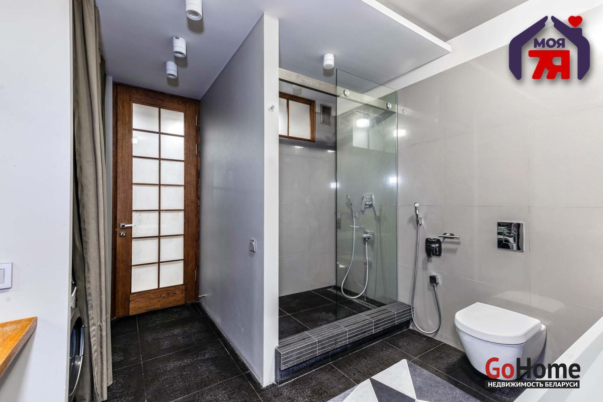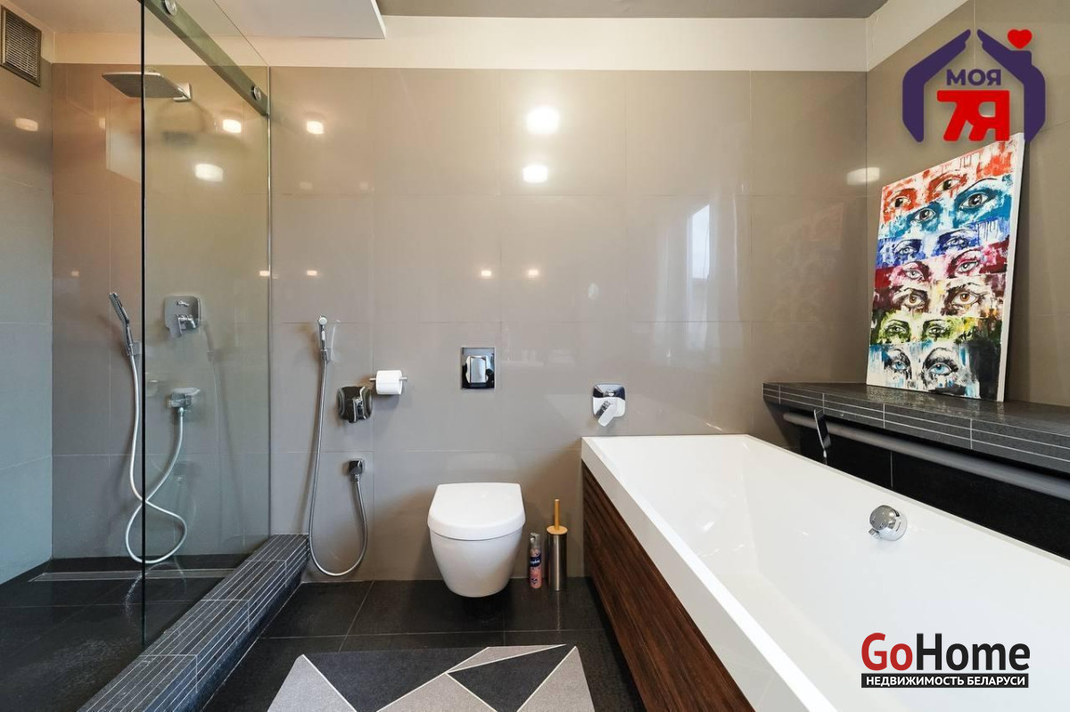 - Просторное помещение объединяет ванну и душевую зону, оформленную с использованием премиальной сантехники "Villeroy & Boch", стильных смесителей и продуманного освещения.