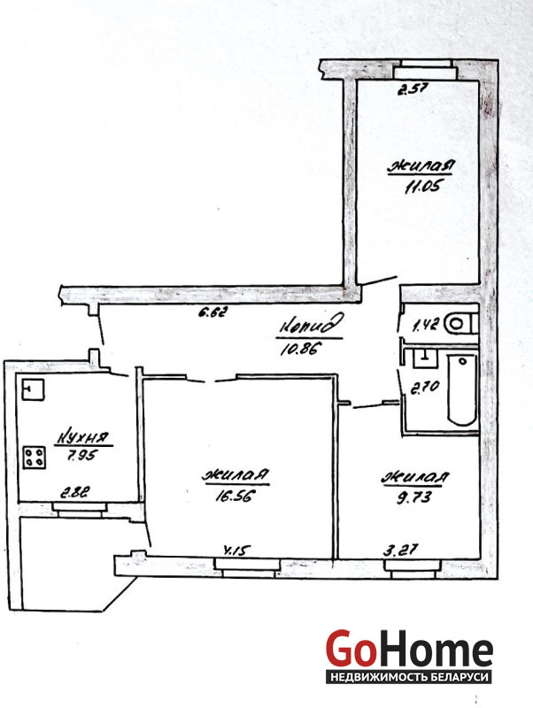 Общая площадь 60.3 кв.м.,жилая 37.34 кв.м., кухня 7.95 кв.м.