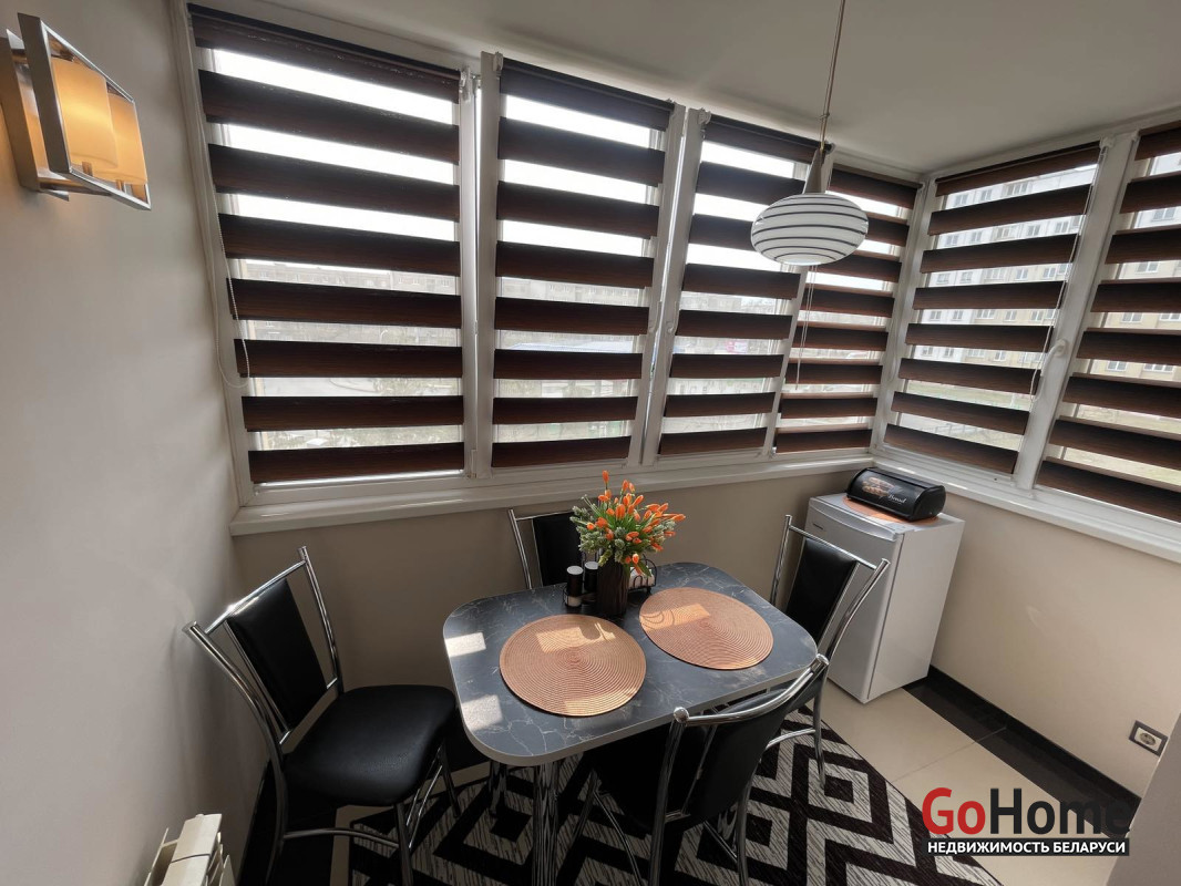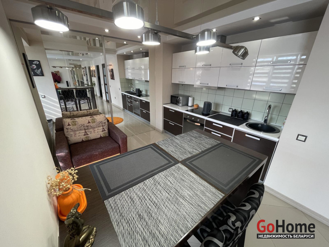 уютная кухня 9.4 м2 совмещена с залом. Одна лоджия 3.2 м2, утеплена, застеклена, сделаны теплые электрические полы. Эксклюзивный ремонт выполнен в современном стиле.