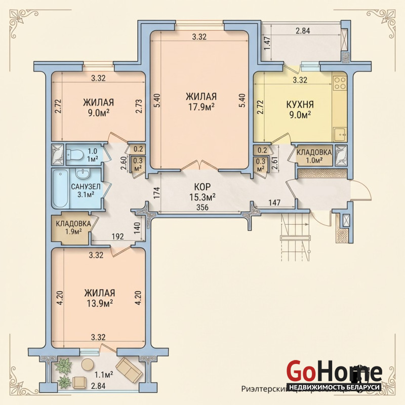 - Большая кухня 9 кв.м.: настоящее сердце дома, где легко собираться всей семьей за завтраком или ужином.