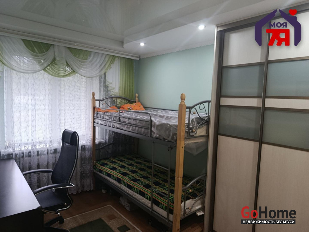 - В большой спальне встроен большой шкаф-купе на всю стену, который служит как комфортная гардеробная. В детской двухъярусная детская кровать , рабочий стол и шкаф-купе.