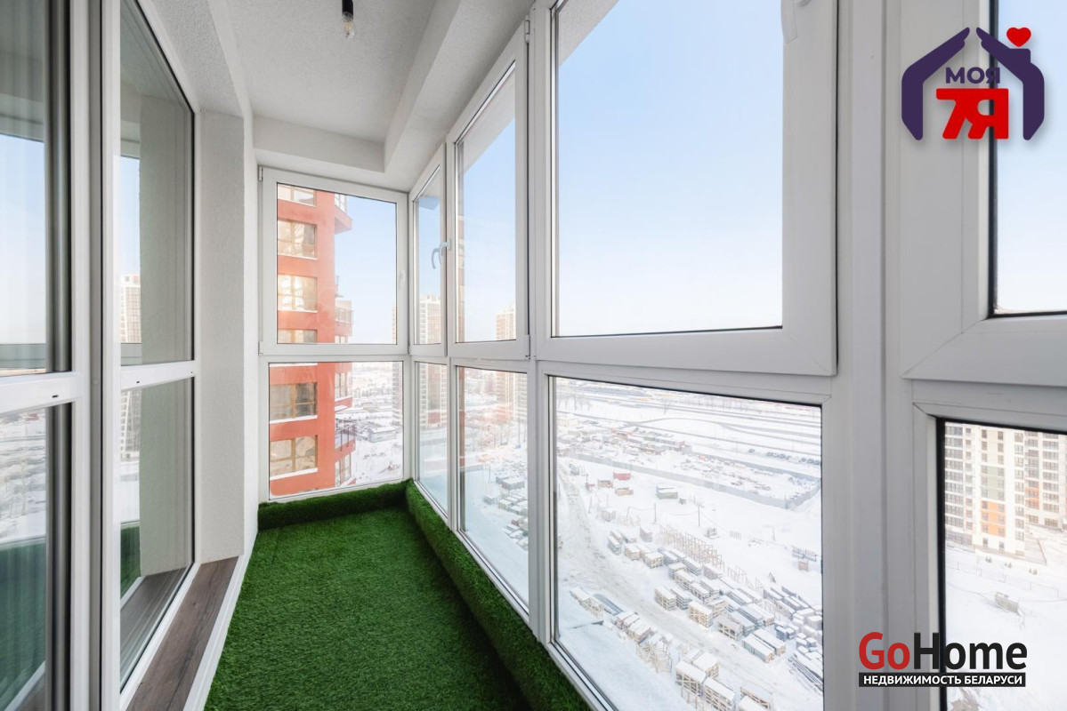 -Застеклённый балкон расширяет функциональность квартиры и может использоваться как зона отдыха или рабочее место с видом на город.