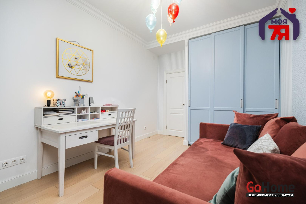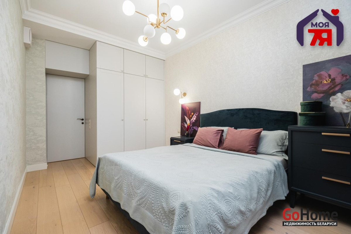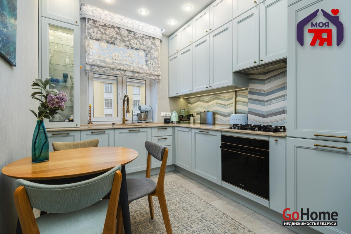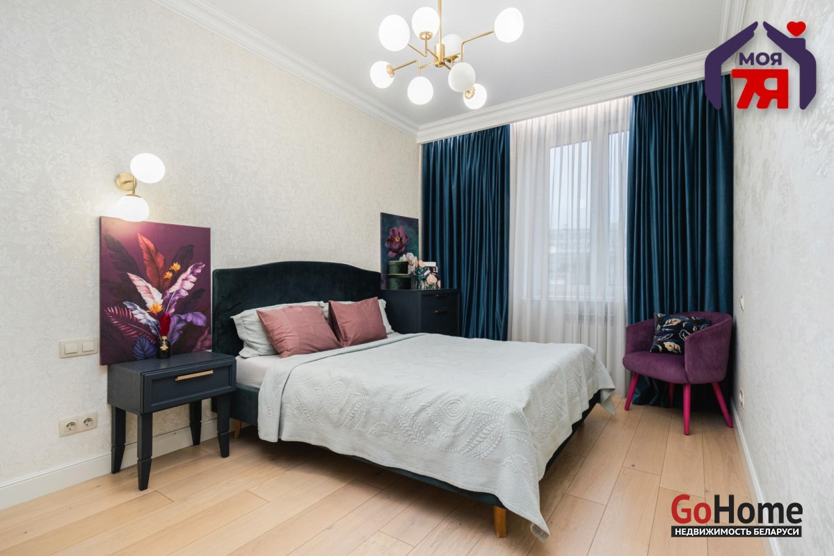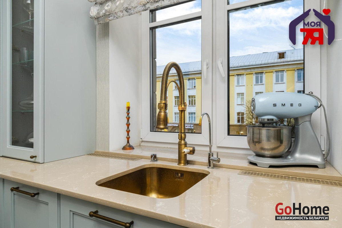 - Просторная квартира площадью 75,7 кв.м расположена на четвёртом этаже кирпичного дома сталинской эпохи с железобетонными перекрытиями. Планировка продумана до мелочей: жилая площадь составляет 45 кв.м, кухня 8,2 кв.м, из гостиной есть выход на балкон с видом во внутренний двор.- Выполнен современный евроремонт с использованием качественных материалов. Интерьер оформлен в едином стиле, где продуманы пропорции, цвет и освещение.- Кухня оборудована встроенным гарнитуром с крашеными фасадами и рабочей поверхностью из натурального камня. Вся техника фирмы SMEG входит в стоимость и включает духовой шкаф, вытяжку, посудомоечную машину, холодильник, варочную поверхность и стиральную машину.- В гостиной уложен паркет и установлена мебель премиум-класса. Комната выходит на открытый балкон, откуда открывается вид во двор. Спальня и детская оформлены аналогично: паркетная доска, качественные обои, окрашенные потолки. Вся обстановка остаётся покупателю.- Ванная и туалет раздельные. В отделке использована плитка, установлена сантехника высокого класса. Прачечная оборудована бойлером и дополнительной стиральной машиной, предусмотрены места для хранения бытовых принадлежностей.- В коридоре расположен встроенный шкаф с крашеными фасадами, на полу плитка. Работает охранная сигнализация. Входная дверь имеет повышенный уровень шумоизоляции.- Дом находится на улице Свердлова в центральной части Минска. Здесь сосредоточены главные достопримечательности и деловые объекты города. В шаговой доступности находятся метро «Площадь Ленина», торговый центр «Галилео», железнодорожный и автобусный вокзалы, гимназия, детский сад, аптеки, кафе и магазины. Поблизости расположен стадион «Динамо» и зелёные дворы, скрытые от городского шума.- Транспортная связь района обеспечивает быстрый доступ в любую часть города. До метро и вокзала пять минут пешком. Поблизости проходят основные маршруты общественного транспорта, предусмотрены удобные выезды на проспекты Независимости и Дзержинского. Локация сочетает ритм центра и развитую городскую инфраструктуру.