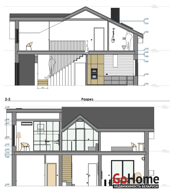 · 1 уровень (активный): Огромная гостиная-столовая (34.5 м2) с выходом на террасу (12 м2), гостевая комната, гардеробная. Сердце дома — котельная с постирочной.