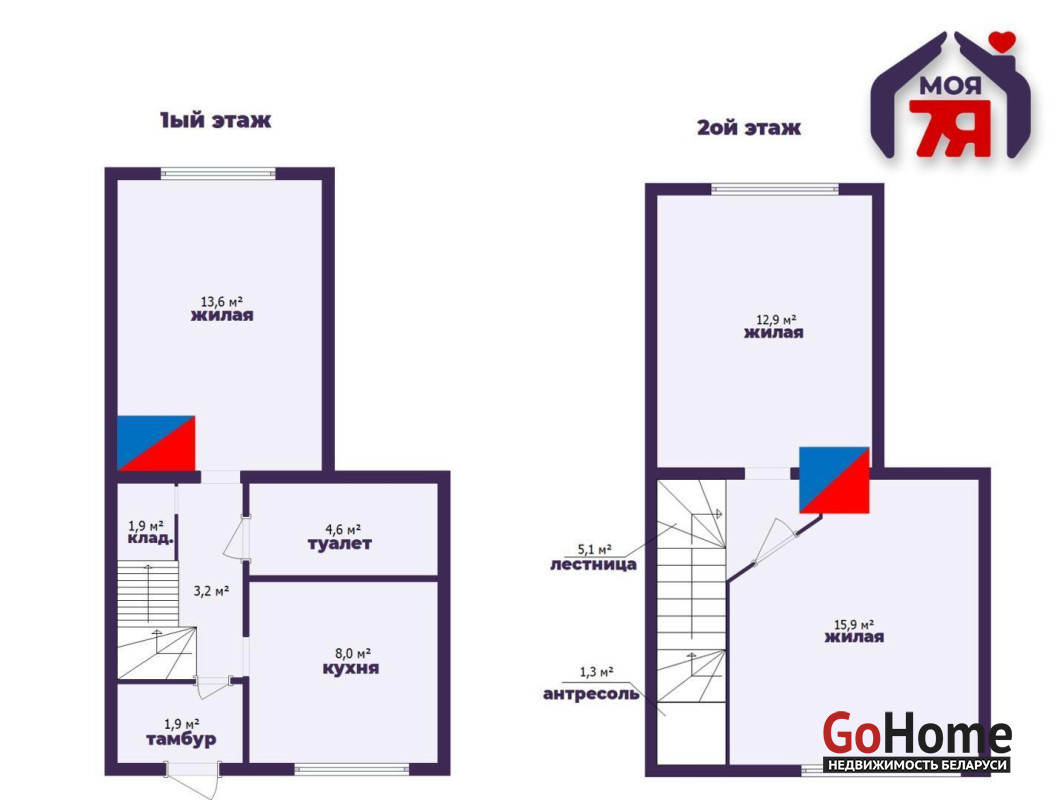 - На первом этаже размещены жилая комната, кухня площадью около 8 м2, санузел и хозяйственные помещения. На втором этаже — ещё одна жилая комната и дополнительные вспомогательные зоны. Квартира без мебели, что позволяет новому владельцу обустроить пространство под себя.