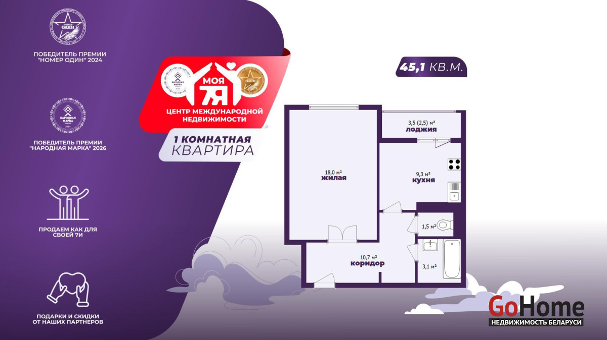 ️ Уютная современная квартира общей площадью по СНБ 45,1 м2 на 12-м этаже панельного дома 2015 года постройки с двумя просторными комнатами (9,3 и 18 м2) и отличным ремонтом, в 10 минутах ходьбы до метро Уручье.