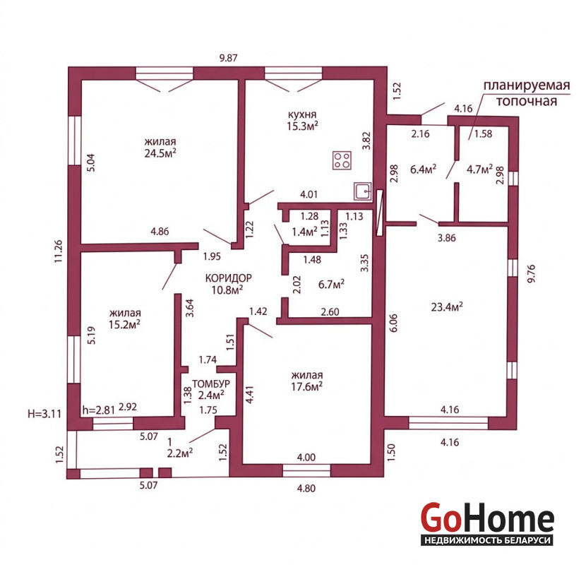 Площадь дома 130,6 м., общая жилая площадь 93,9 м., площадь жилых комнат — 57,3 м. Планировка дома включает: Кухня 15,3 м, три жилых комнаты 24,5 м, 17,6 м, 15,2 м. Ванная комната 6,7 м. Санузел 1,4 м.