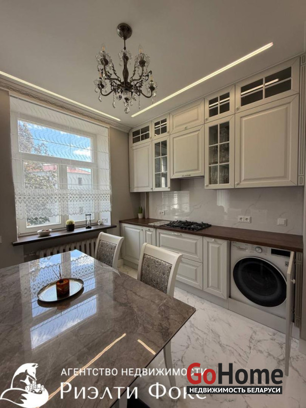 Квартира полностью укомплектована всей необходимой мебелью и техникой (посудомоечная машина, стиральная машина с функцией сушки, водонагреватель, холодильник). На полу в квартире - паркет (дуб) и плитка керамогранит. Обеденный стол выполнен из керамогранита. Размер кровати - 1800*2000, в спальне есть вместительная гардеробная. В квартире много мест для хранения. Толщина стен - 50 см, высота помещений - 2,95 м., есть балкон. Окна квартиры выходят на две стороны. Квартира готова к заселению.
