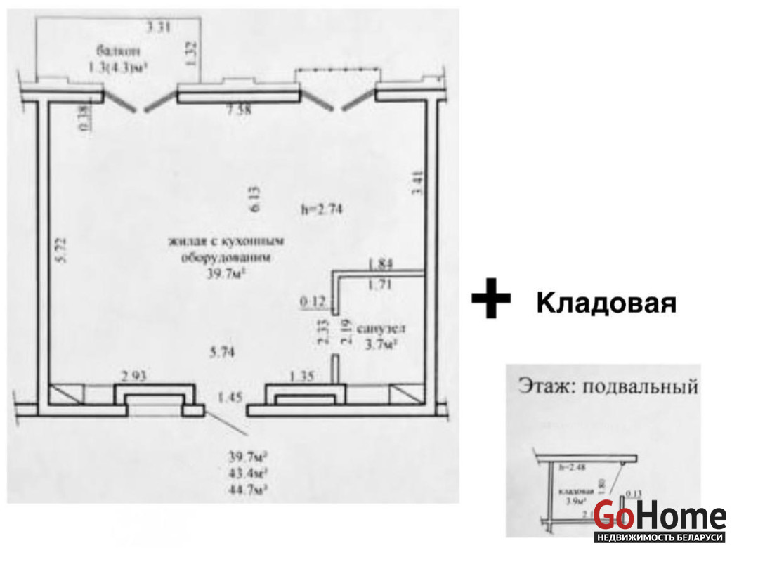 Площадь по СНБ: 44,7 кв. метров, с балконом + КЛАДОВАЯ 3,9 кв. метров = 48,6 КВ.МЕТРОВ