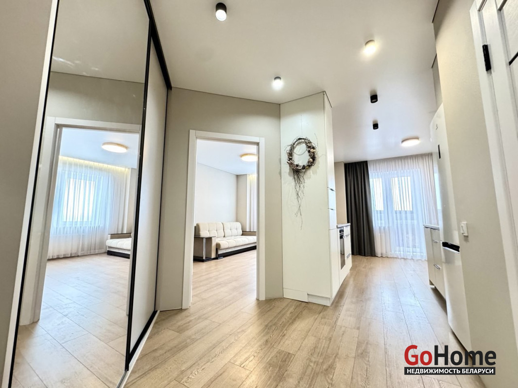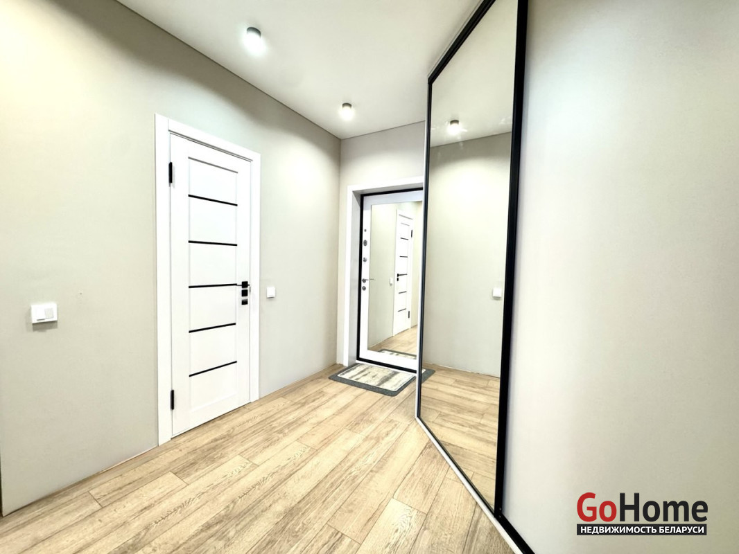 На полу уложен немецкий ламинат премиум класса. Новая входная металлическая зеркальная дверь, потолок натяжной (высота 2,75), в коридоре установлен шкаф-купе, с использованием качественной фурнитуры.