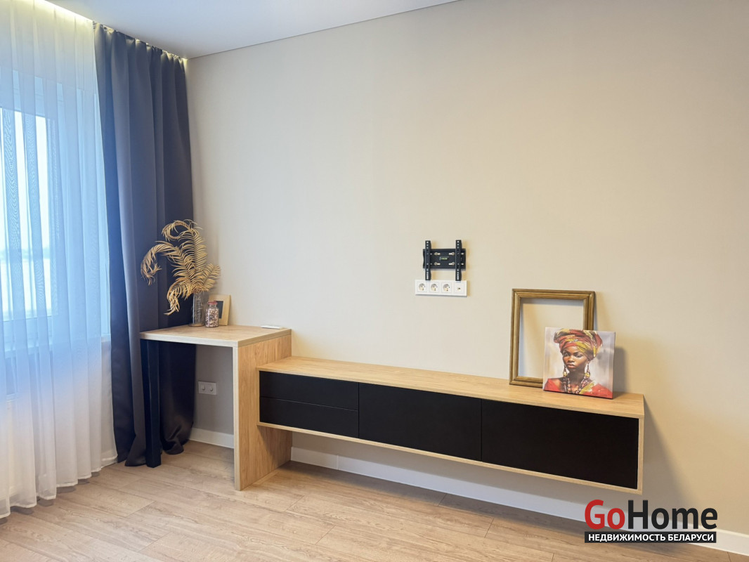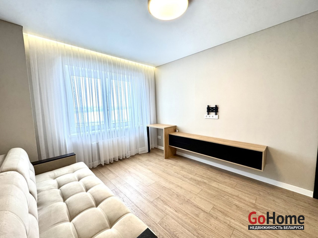 Потолок со встроенным освещением. Комната зонирована, что обеспечивает рациональное использование пространства. Имеется просторная лоджия, откуда можно наслаждаться прекрасными закатами.