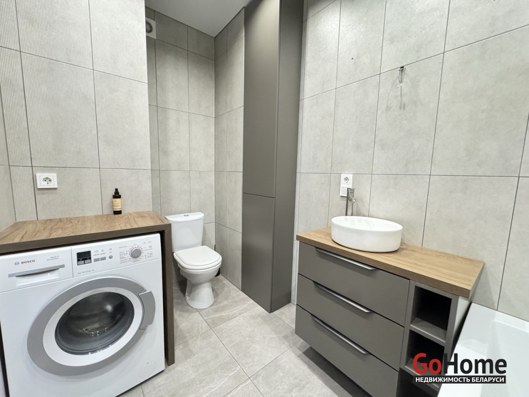 Ванна и с/у облицованы итальянской плиткой, оборудованы современной сантехникой, местами для хранения и стиральной машиной фирмы Bosch.