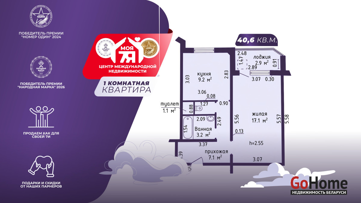 -Общая площадь квартиры составляет 40,6 квадратных метров по СНБ, что создаёт оптимальное пространство для комфортного проживания одного человека, молодой пары или небольшой семьи.