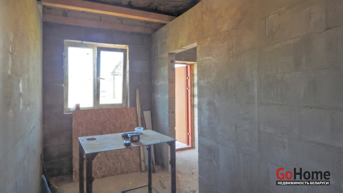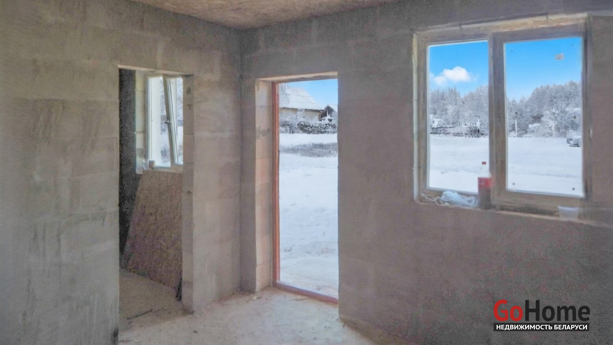 Дом подготовлен под чистовую отделку: оштукатурены стены, выполнена стяжка пола, установлены стеклопакеты, двойная металлическая входная дверь.