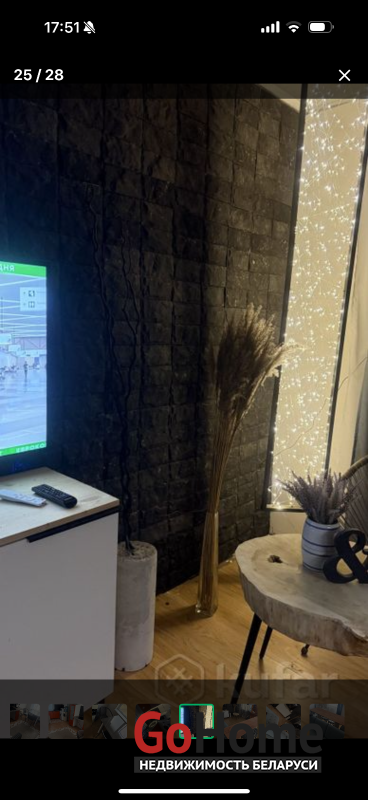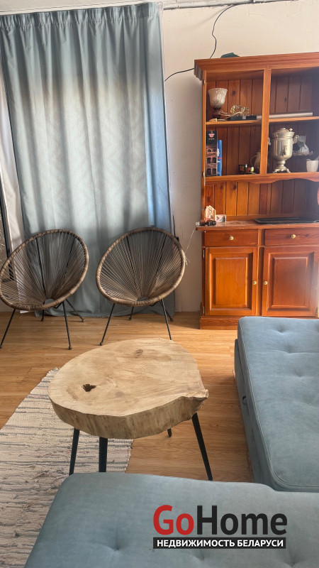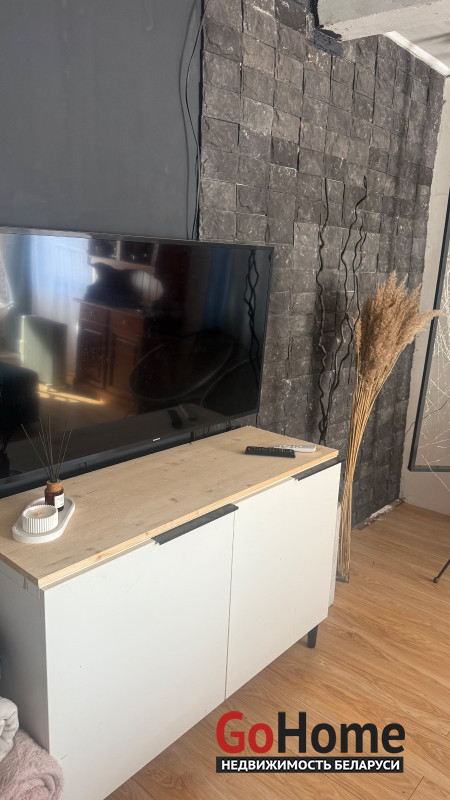 Большая комната с мебелью и телевизором, совмещенная с оборудованной кухней (варочная панель Electrolux