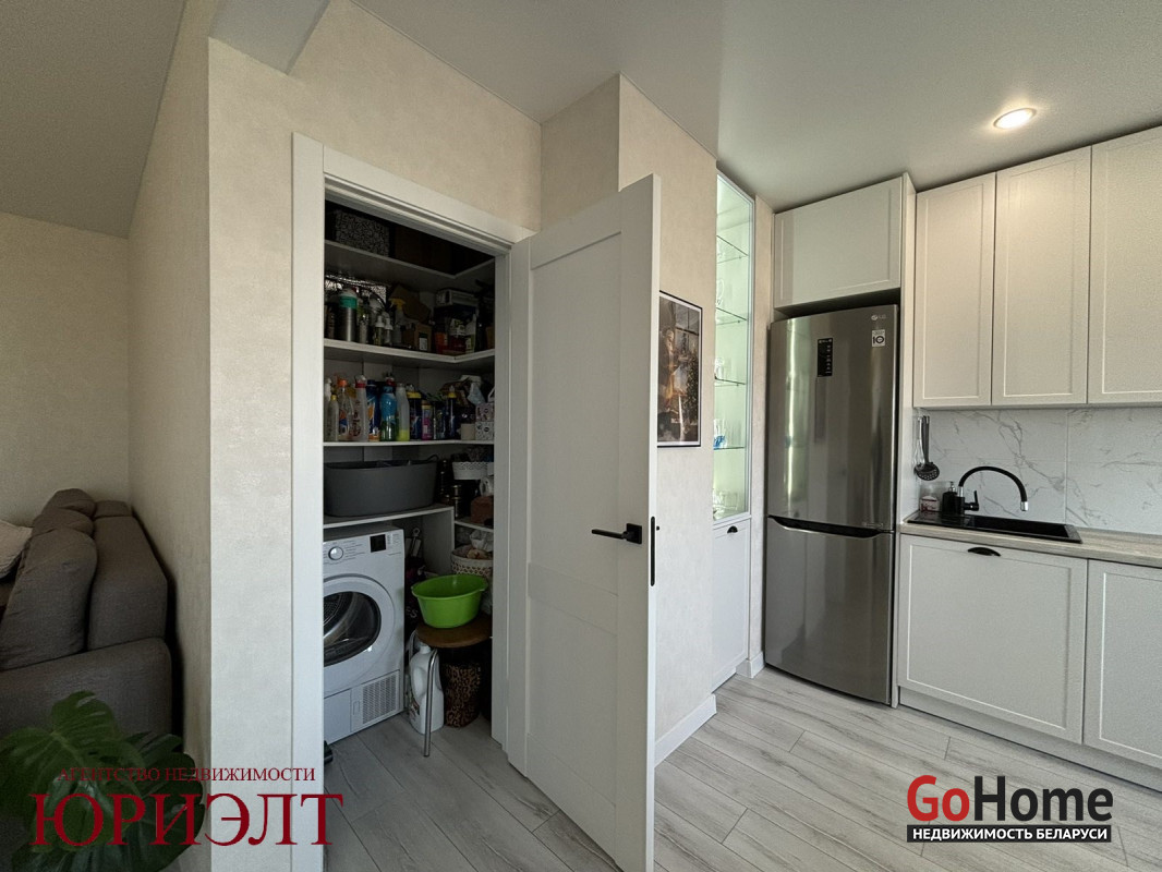 Практичная планировка: просторная кухня-гостиная, две спальные комнаты. Два помещения для хранения, оборудованные полками - кладовая и гардеробная. Застекленная лоджия. Совмещённый санузел.