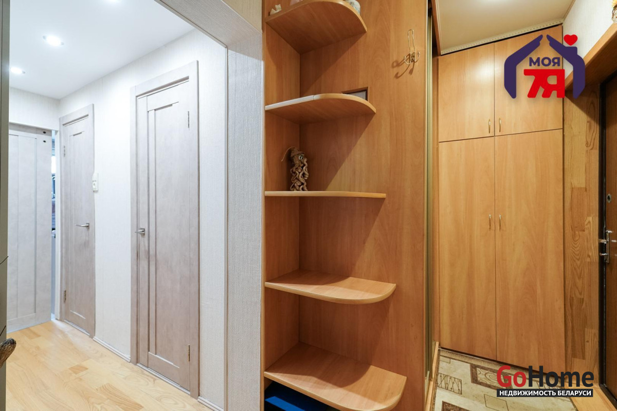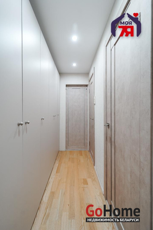 - Пол уложен паркетом, установлены новые межкомнатные двери, новые двухкамерные окна и натяжные потолки. Вдоль коридора также установлены новые вместительные встроенные шкафы — продуманное решение для хранения личных вещей и создания порядка в доме.