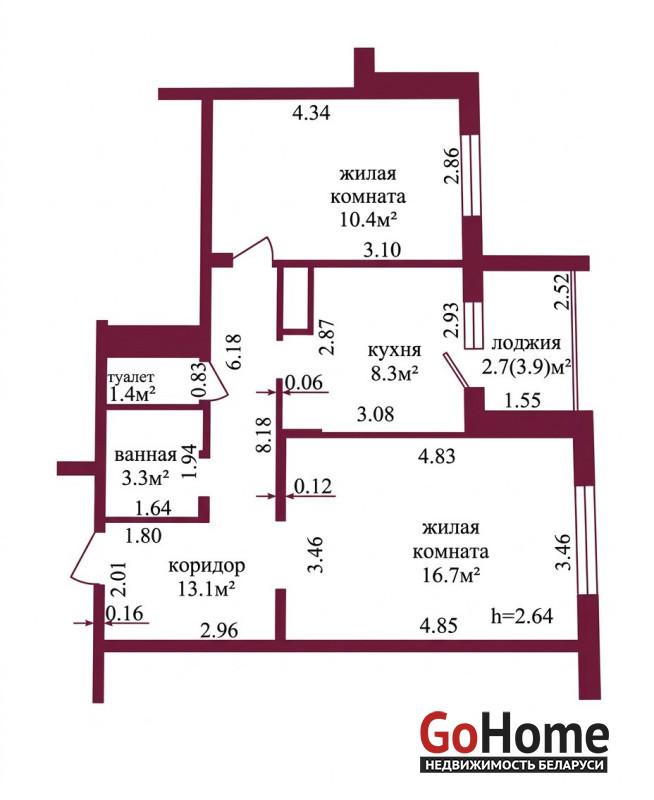 Общая площадь – 56 кв. м., жилая – 21 кв. м., кухня – 8,3 кв. м.
