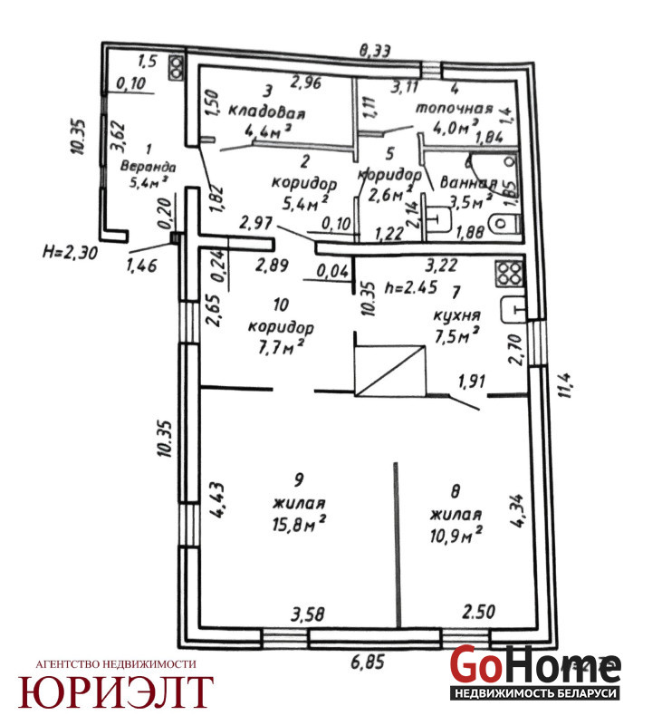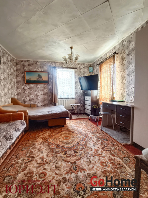 Общая площадь – 67,2 м², жилая – 26,7 м², кухня – 7,5 м², с/у – совмещён . В доме две раздельные жилые комнаты, есть топочная, кладовая с погребом и веранда.