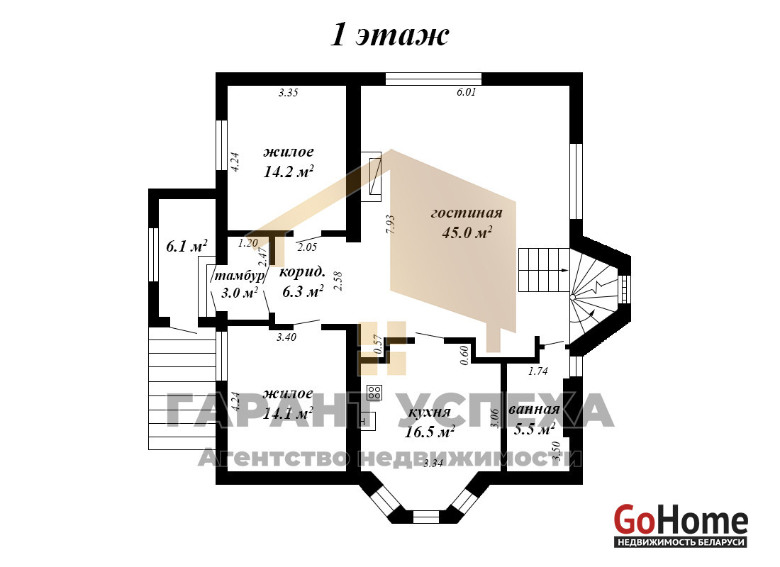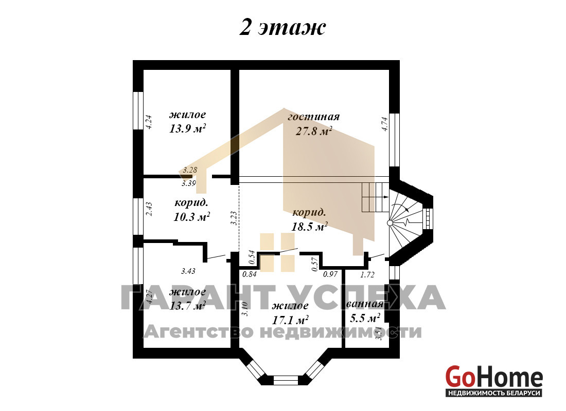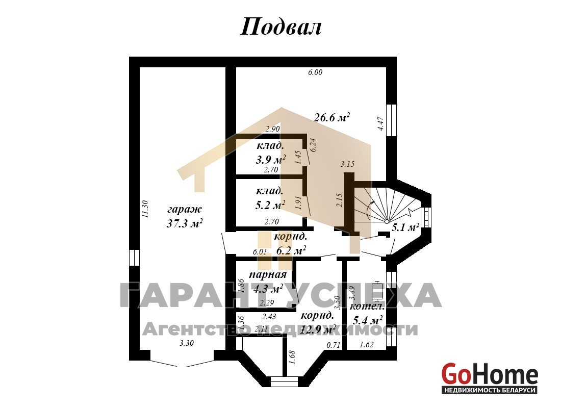 Общая площадь здания составляет 330,1 кв.м, жилая площадь составляет 145,8 кв.м. В доме жилые комнаты равномерно размещены на разных уровнях, на первом этаже имеется кухня, гостиная с винтовой деревянной лестницей, две жилые комнаты, раздельный санузел, выход на цокольный этаж. Уют и тепло гостиной первого этажа дополнительно придаёт действующий камин. На втором этаже имеется вторая гостиная, три спальни и второй совмещённый санузел. А на мансардном этаже Вы запросто можете оборудовать спортзал, бильярдную или что-то по своему усмотрению. Отдельных слов заслуживает цокольный этаж, вместивший в себя парную с небольшим, глубоким бассейном, кладовые, мастерскую и автомобильный гараж.
