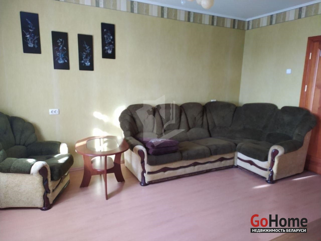 Гостиная: Большая проходная комната с удобным угловым диваном, дополнительным креслом и журнальным столиком. Идеальное место для отдыха и вечернего просмотра ТВ.