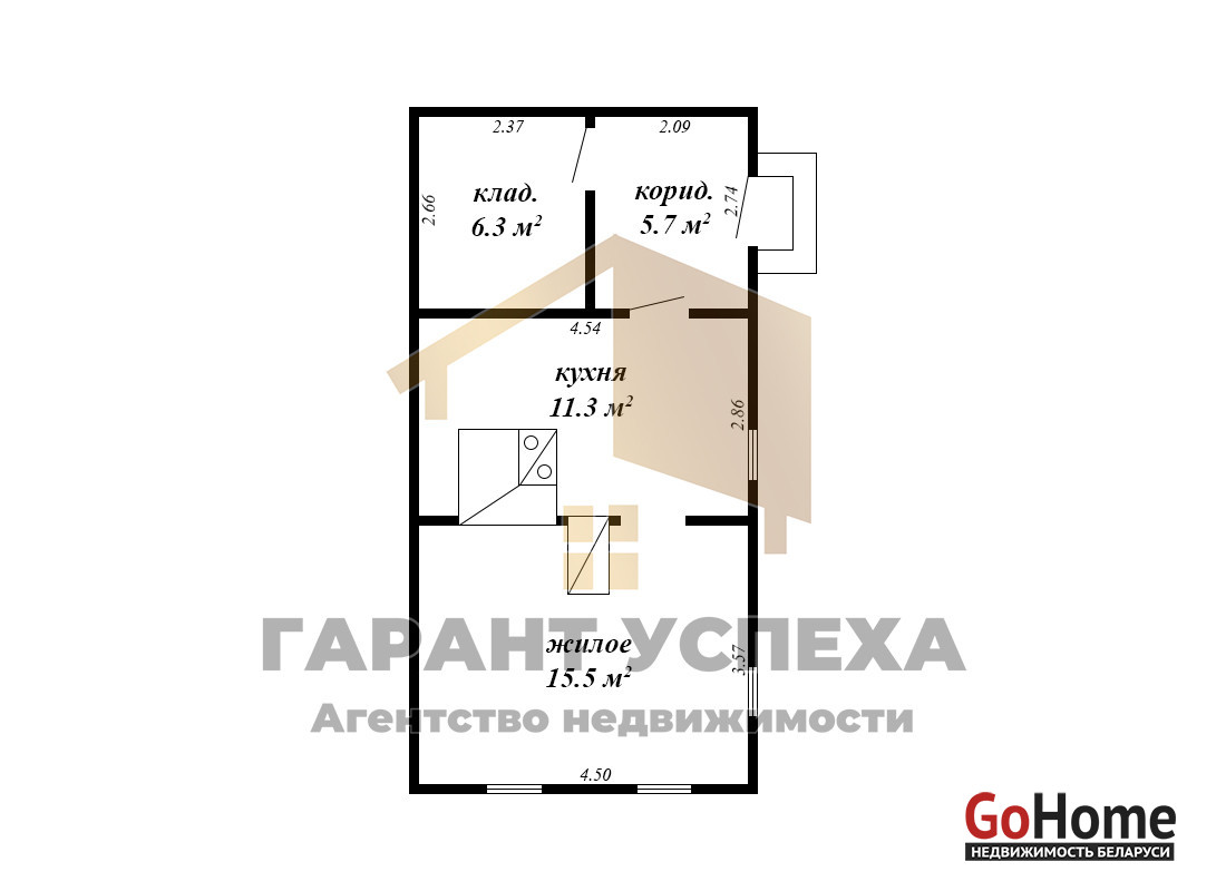 Общая площадь – 38,8 кв. м, жилая – 15,5 кв. м, кухня – 11.3 кв. м. Высота потолка – 2,50 м.