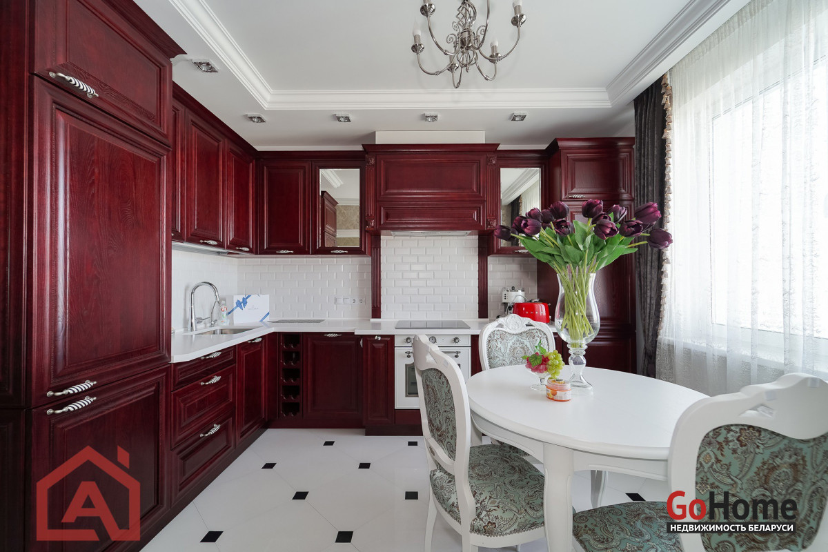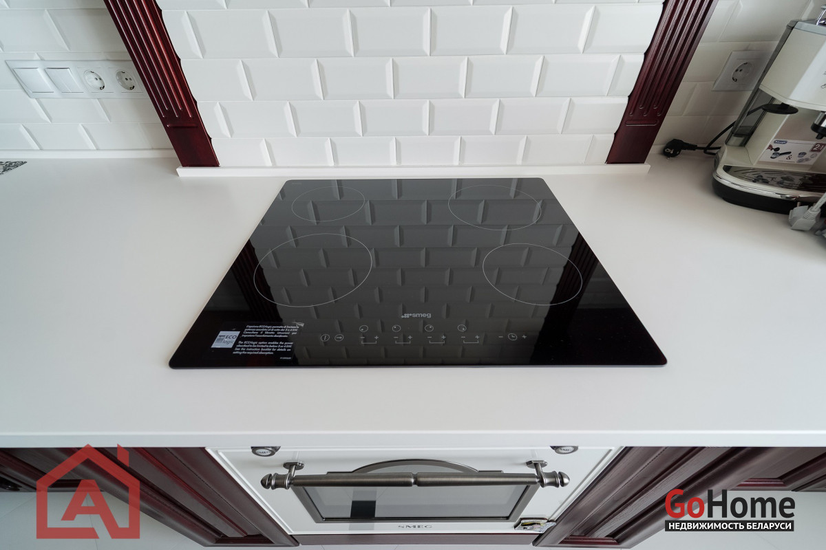 -Просторная кухня-столовая оформлена красиво, нарядно и функционально: матовые фасады из массива дерева гармонируют с белоснежной каменной столешницей, создавая идеальный баланс между основательностью и домашним уютом. Рабочая зона выложена белой плиткой с аккуратной геометрией, оснащена встроенной и отдельно стоящей техникой SMEG. Продуманная электрика и многоуровневая подсветка делают пространство удобным для готовки, приема пищи и отдыха.