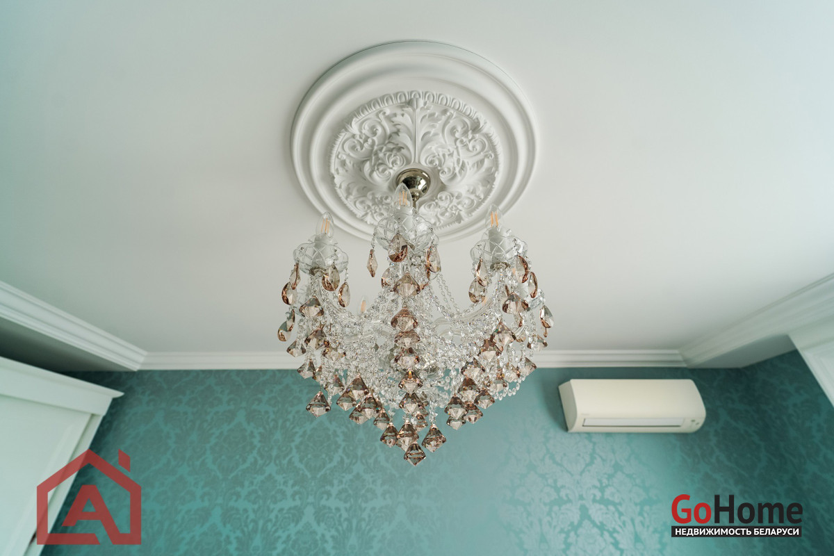 Интерьер наполнен жизнью благодаря мебели из натурального дерева и кожи. Изысканные арт-объекты, гобелены и дизайнерская мебель создают завершенный образ. А настоящая «вишенка на торте» — это великолепные светильники из чешского (богемского) хрусталя. Их сияние наполняет квартиру теплом и подчеркивает статусность пространства.