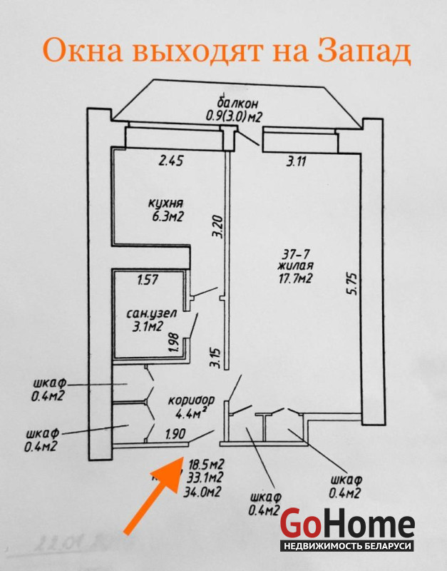 Площадь по СНБ: 34 КВ.МЕТРОВ, но балкон фактически 3 метра