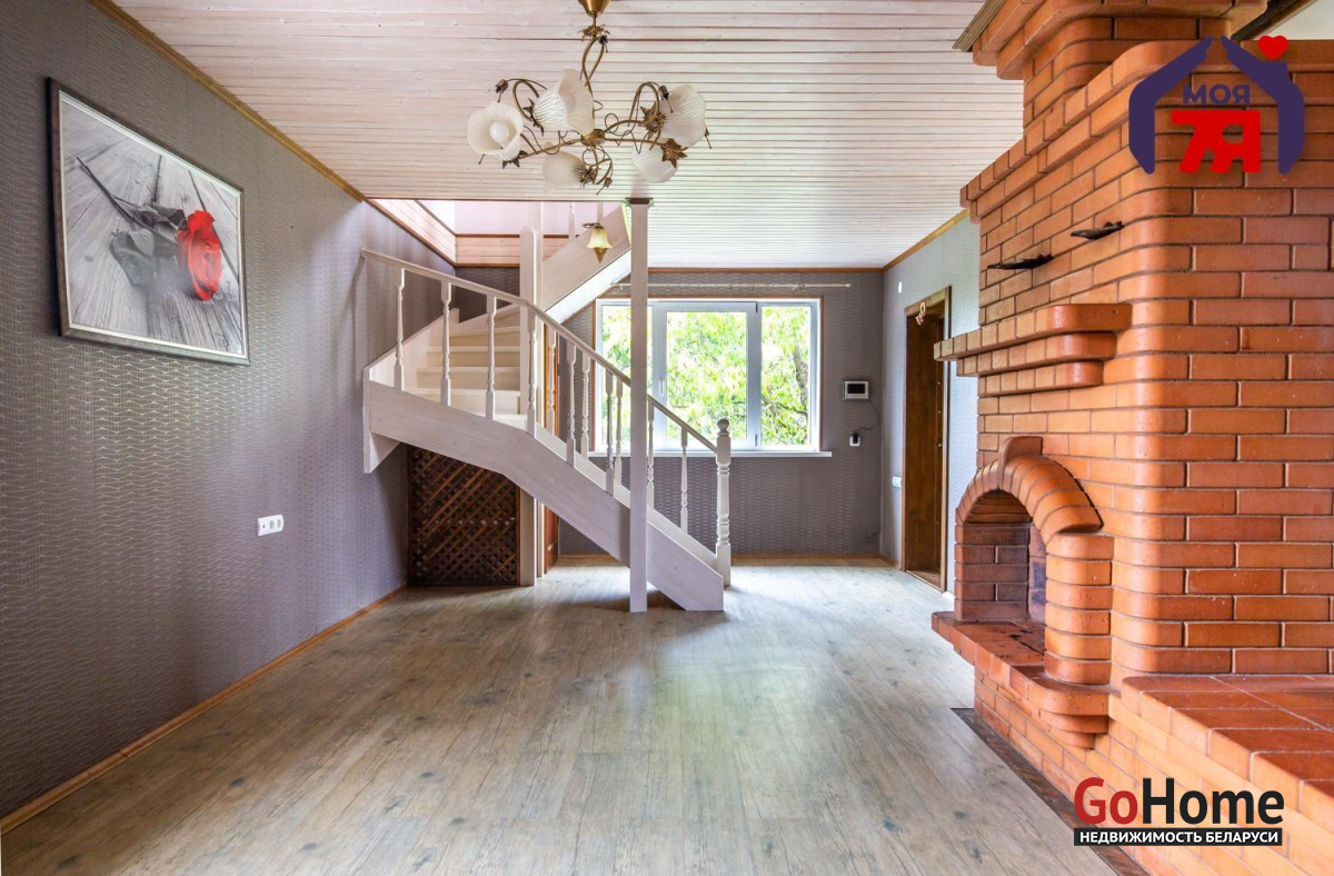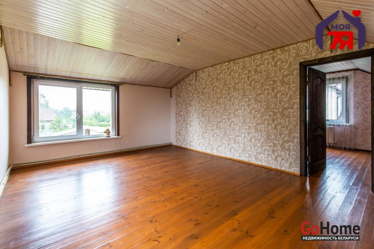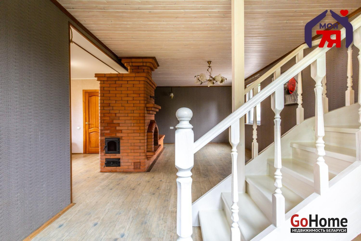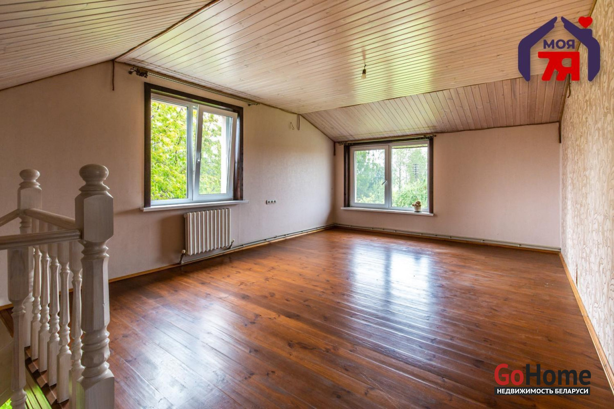 - Второй этаж: две светлые комнаты с деревянными полами и вагонкой на потолках.Изящная белая лестница с декоративными балясинами соединяет этажи. Центральное водоснабжение, местная канализация, твердотопливный котёл. Установлены видеонаблюдение.