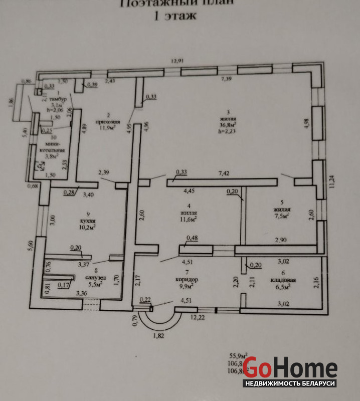 Общая площадь – 106,8 м², жилая площадь – 55,9 м², кухня – 10,2 м².