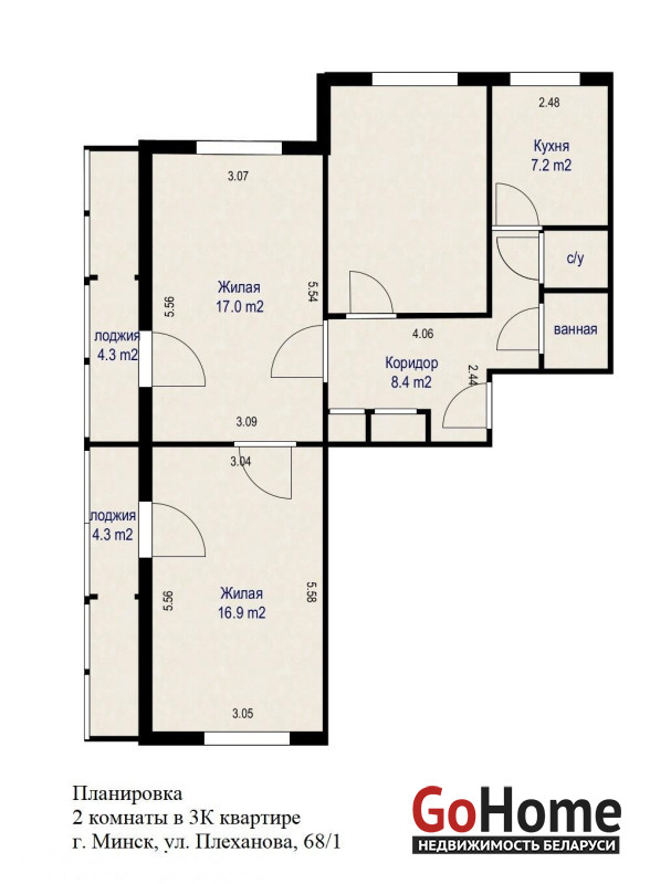 Продается 2-е выделенные смежные комнаты 17м.кв. и 16.9м.кв. В каждой комнате лоджия 4.3м.кв. в трёхкомнатной квартире по адресу Плеханова, 68/1