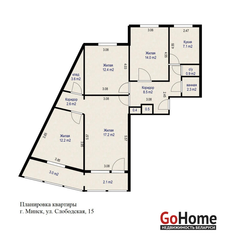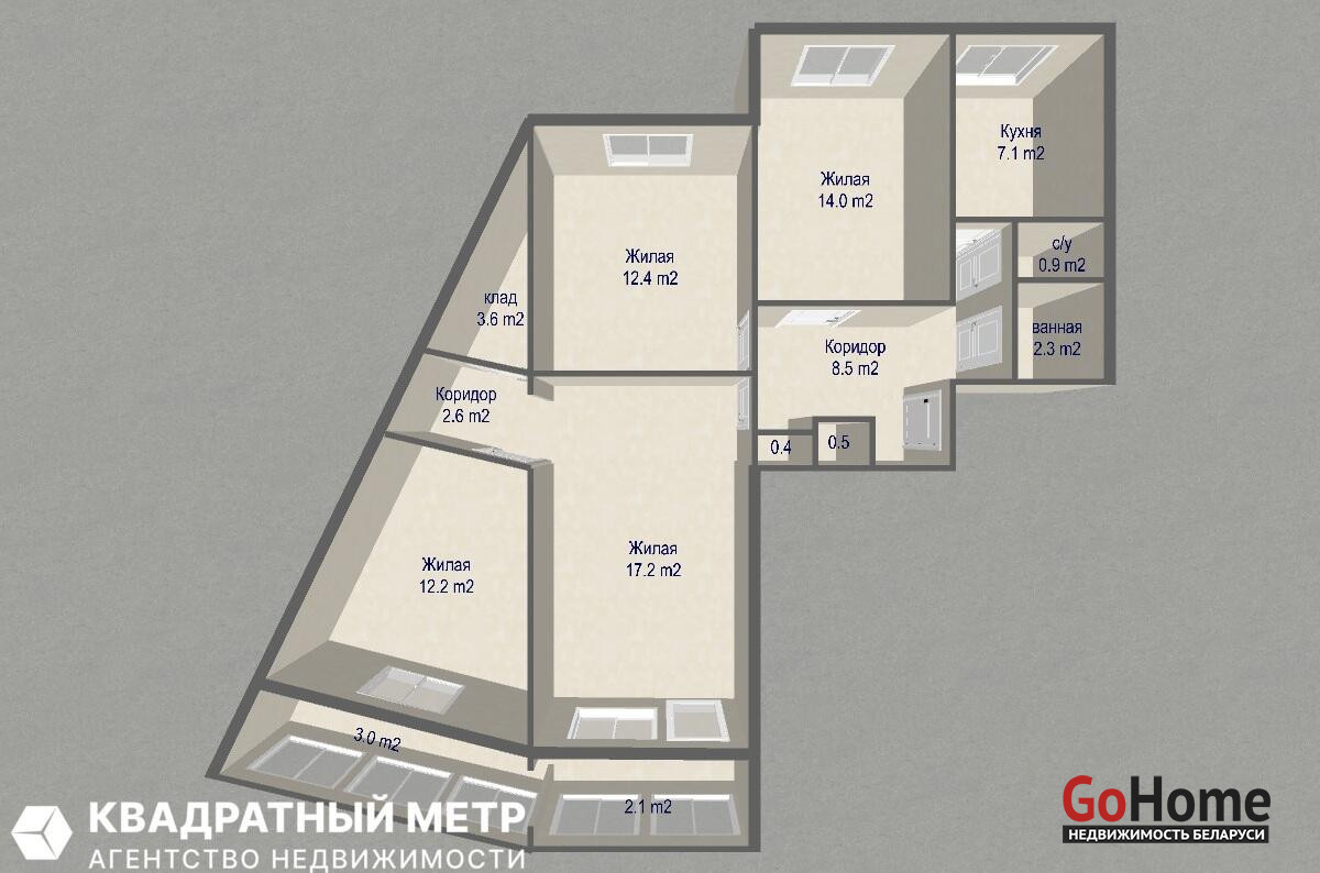 Общая площадь 81.7 кв. м., жилая площадь 55,8 кв. м, кухня 7,1 кв. м. высота потолков 2.54 м., двойная лоджия застеклена.