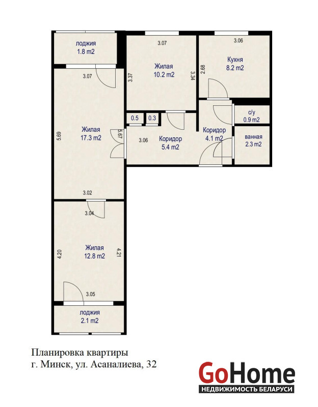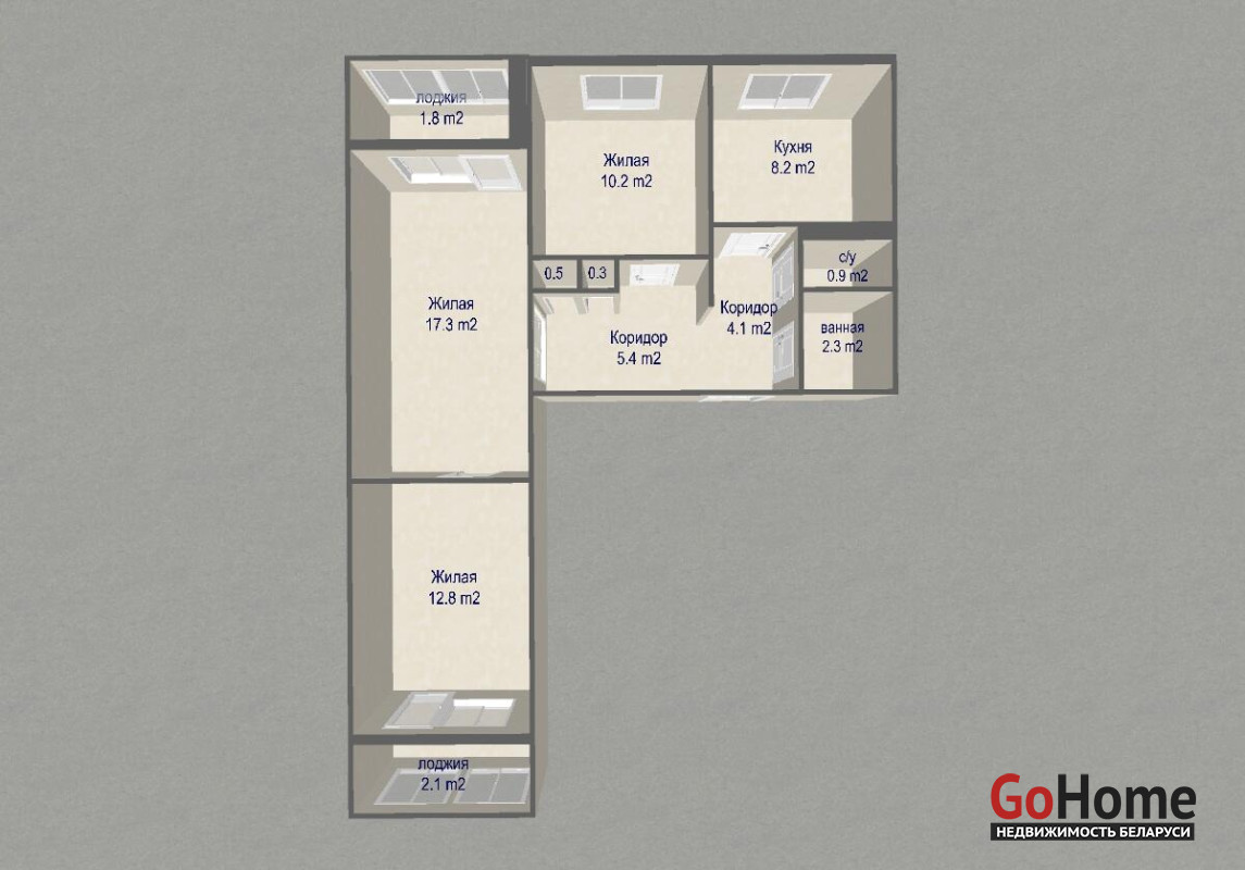 - Жилые комнаты: 17,3 кв.м., 12,8 кв.м., 10,2 кв.м.,
